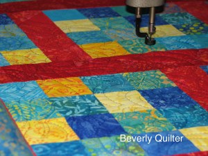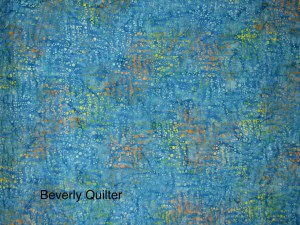 The quilting design of spinning flowers in a royal blue thread adds to the movement and fun in this quilt. From bits of fabric just hanging around to a happy quilt. I even surprised myself with this one! This quilt is available for sale on http://www.eBay.com search for “scrappy batik quilts”.