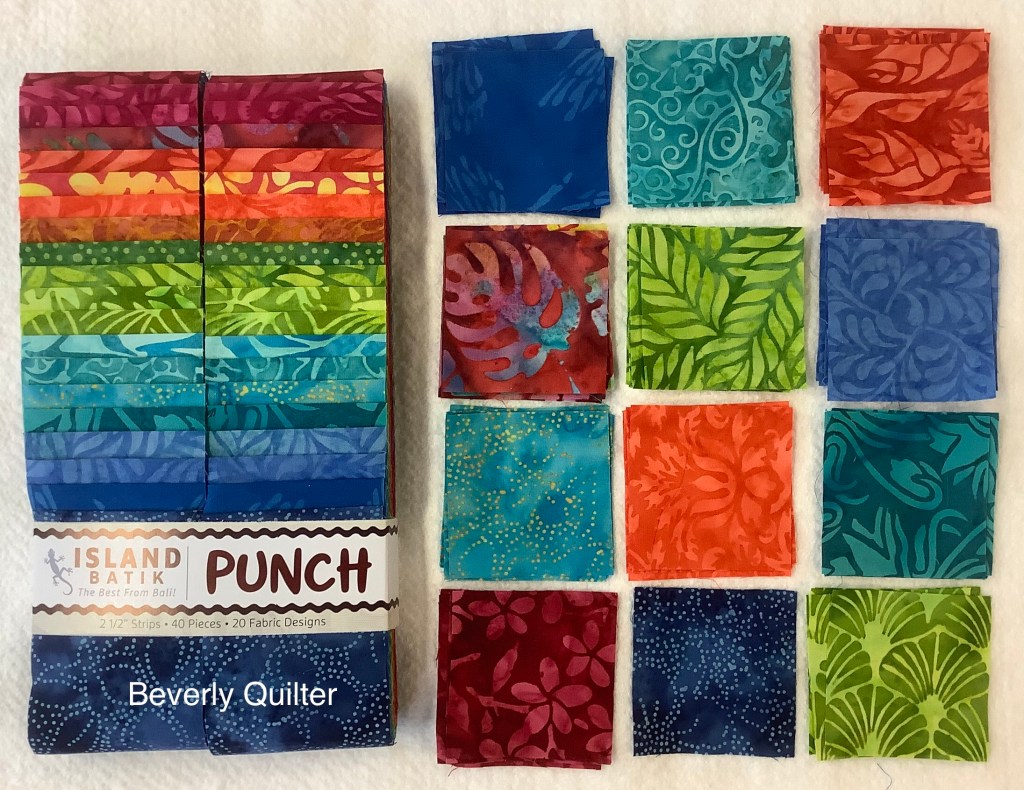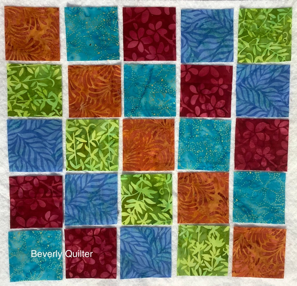 With a little planning I decided the best use of the strips would be to cut them down to 2 1/2” squares, then lay those squares out in five rows of five squares which when sewn together resulted in a 10”x10” finished block.