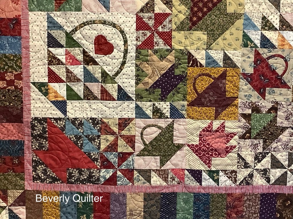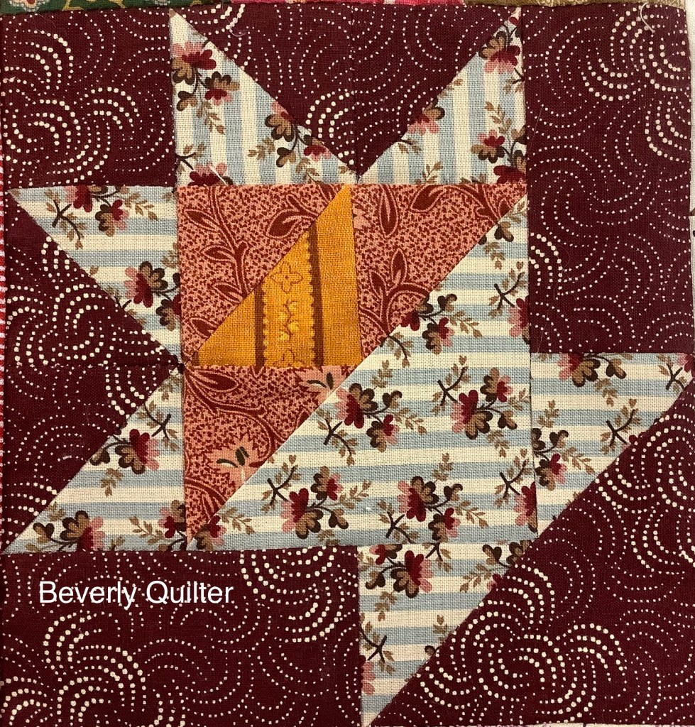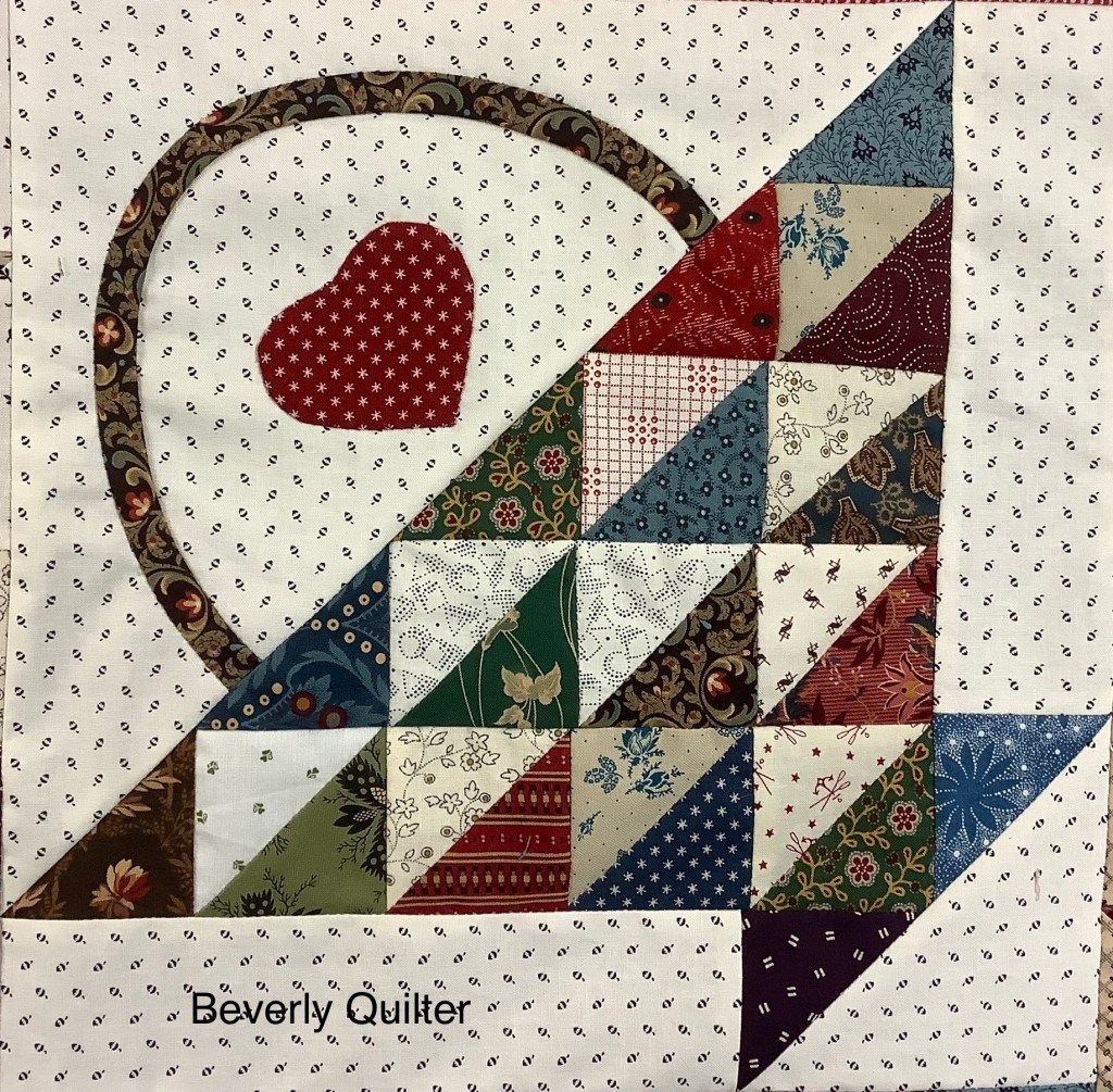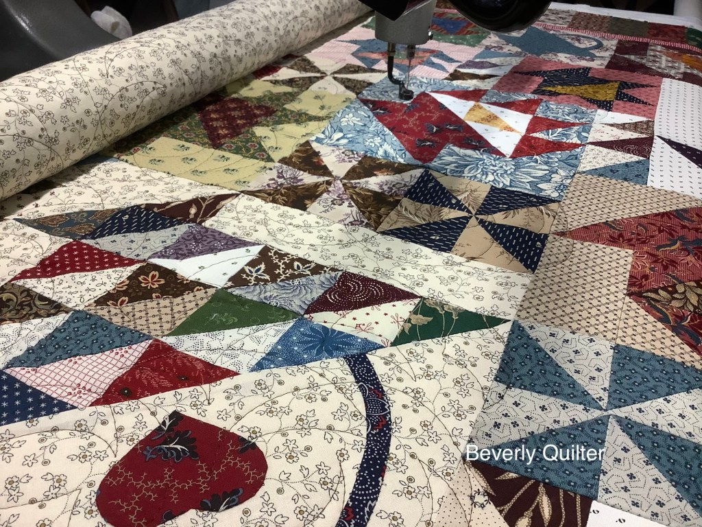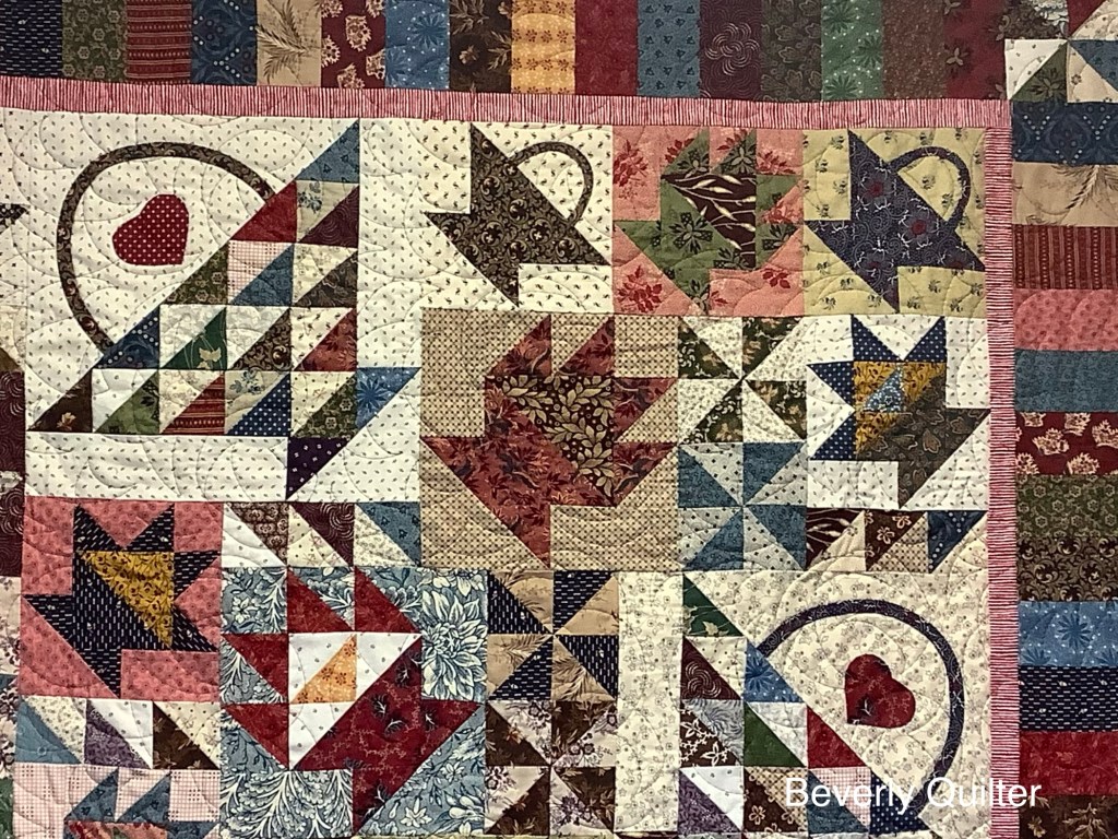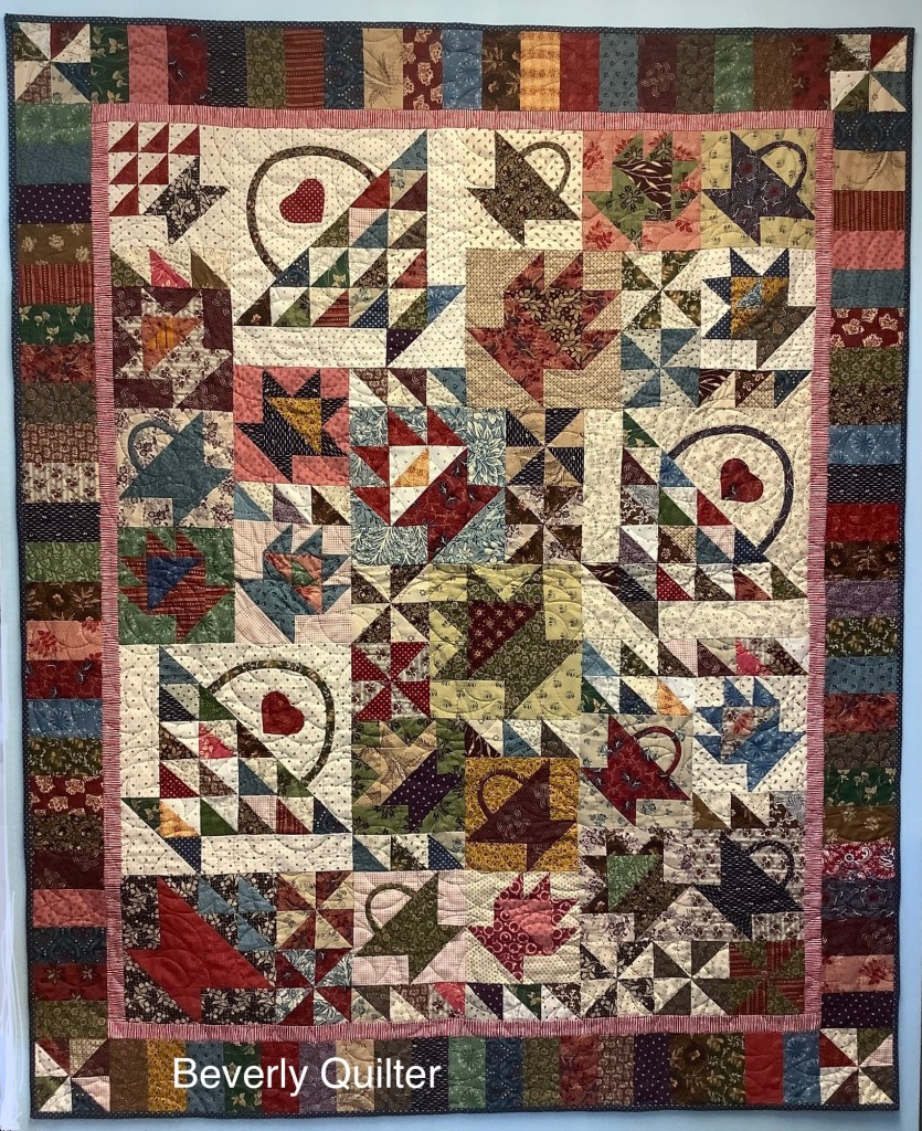 One of the lessons involved making a bunch of 2” finished half square triangle units. They were used to create some of the baskets and as fillers in the odd spaces. Once I had all my blocks made and my puzzle put together, I added a piano key border which made the finished quilt a nice lap size of 46” x 56”. I machine quilted this one in an all over abstract design with brown thread. I had a lot of fun making this one. I’m thinking of making a similar one some day with different type blocks and the same fabric pallet to put up for sale, but this basket one I’ll keep for display in my home.