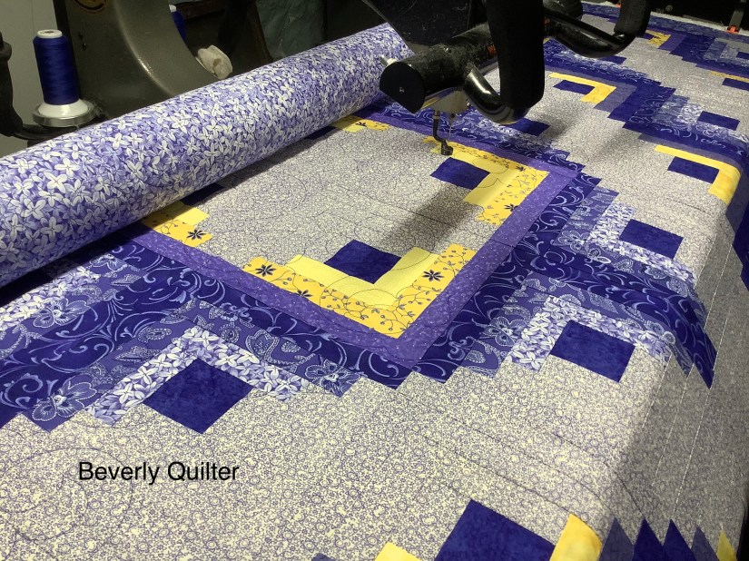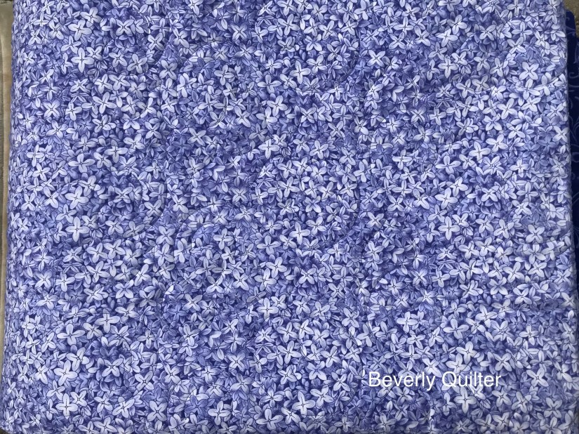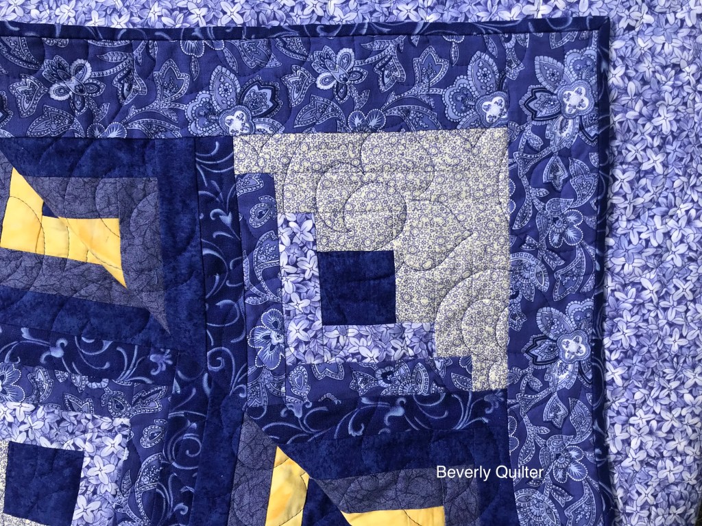 I quilted this one in an all over edge to edge abstract vine design with royal blue thread. The blue and white floral backing compliments the front of the quilt where I did use some of it in the blocks.