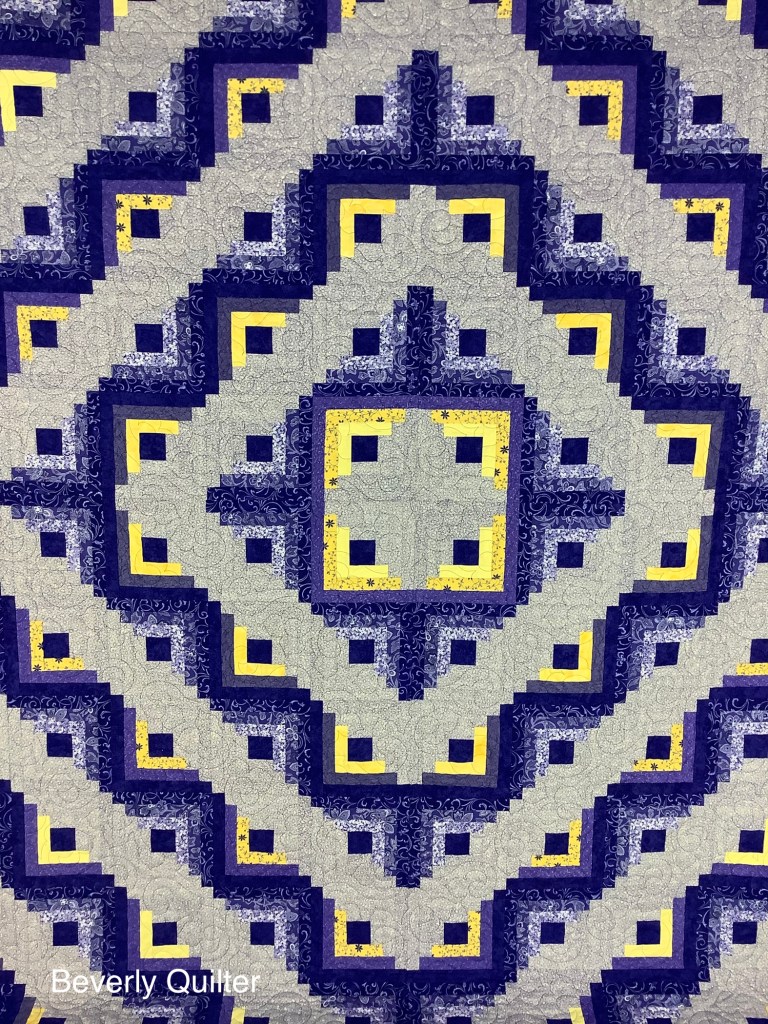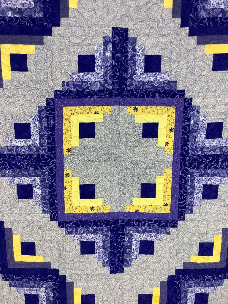 This traditional design called “Log Cabin” was one of the first styles of quilt that I learned to make. For this one I chose to place the blocks in the “Barn Raising” setting. I put a twist on the classic colors of blue and white by using periwinkle and royal blues,a white fabric printed with a royal blue floral design and buttery yellow fabrics for added accent. I liked the way this one turned out. This 84”x100” queen sized quilt is available for sale on http://www.eBay.come. Please search for “Blue & White Log Cabin Quilts”.