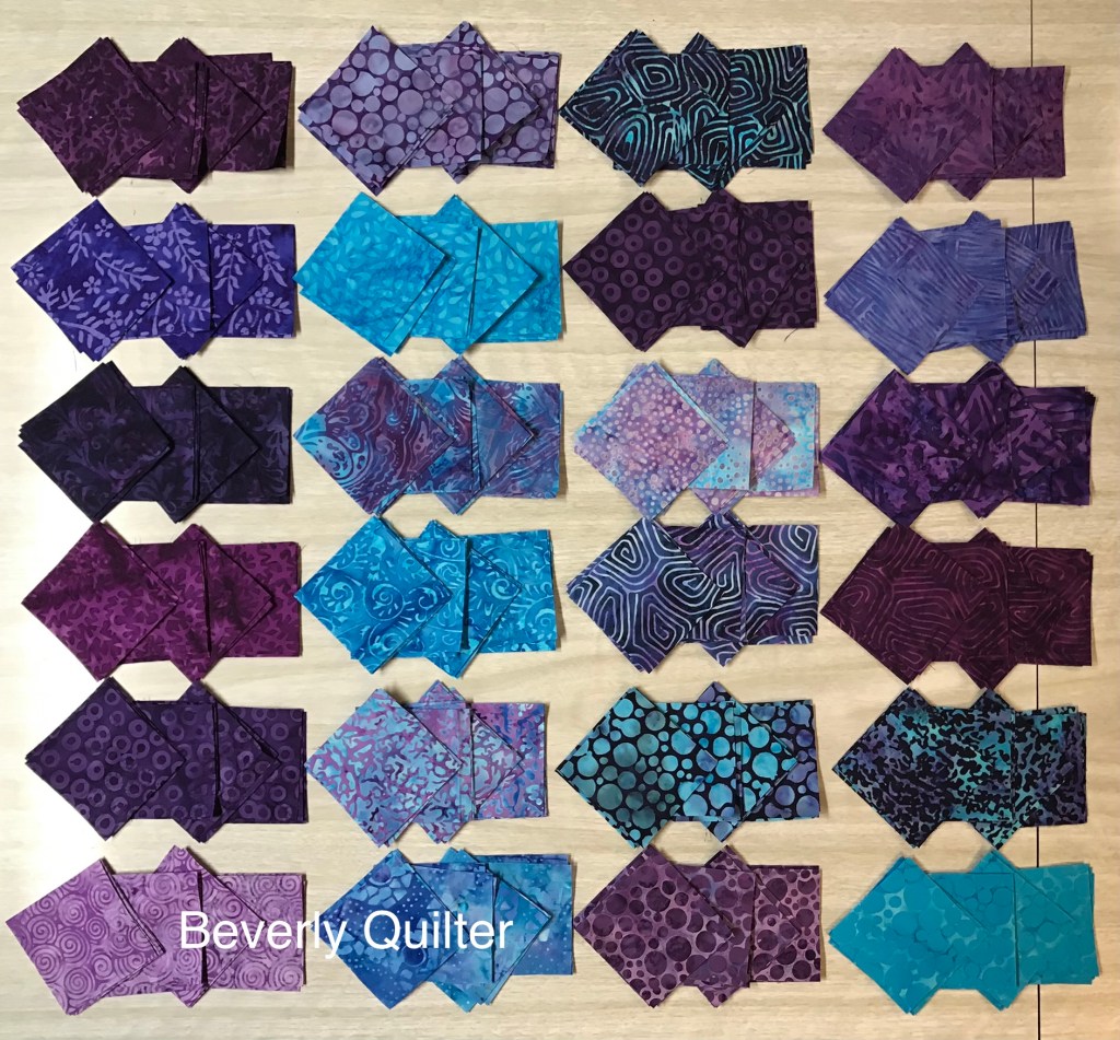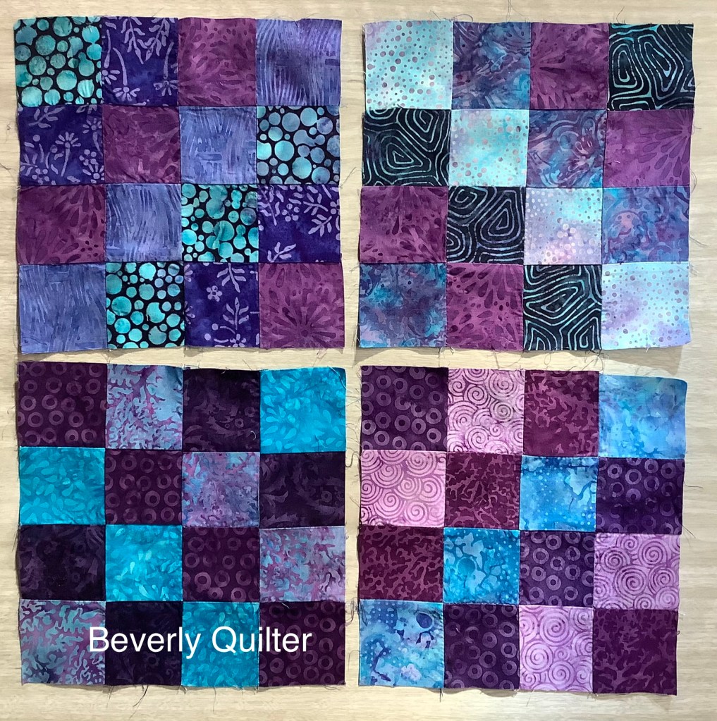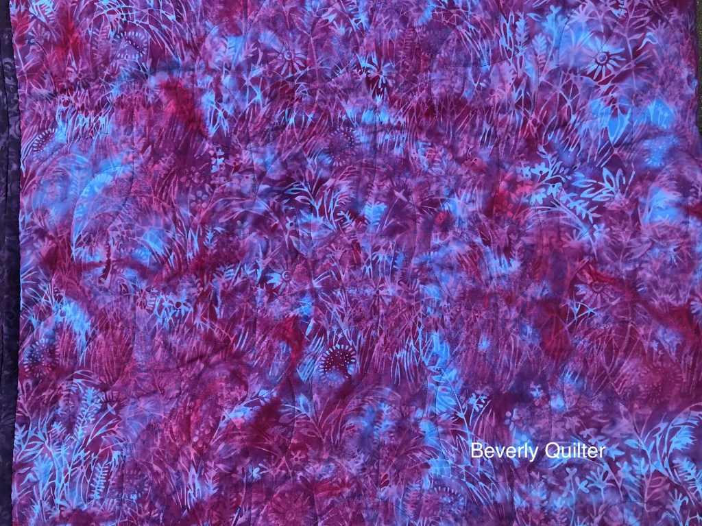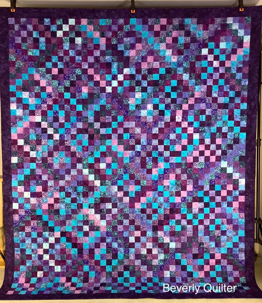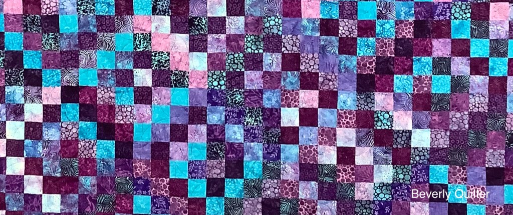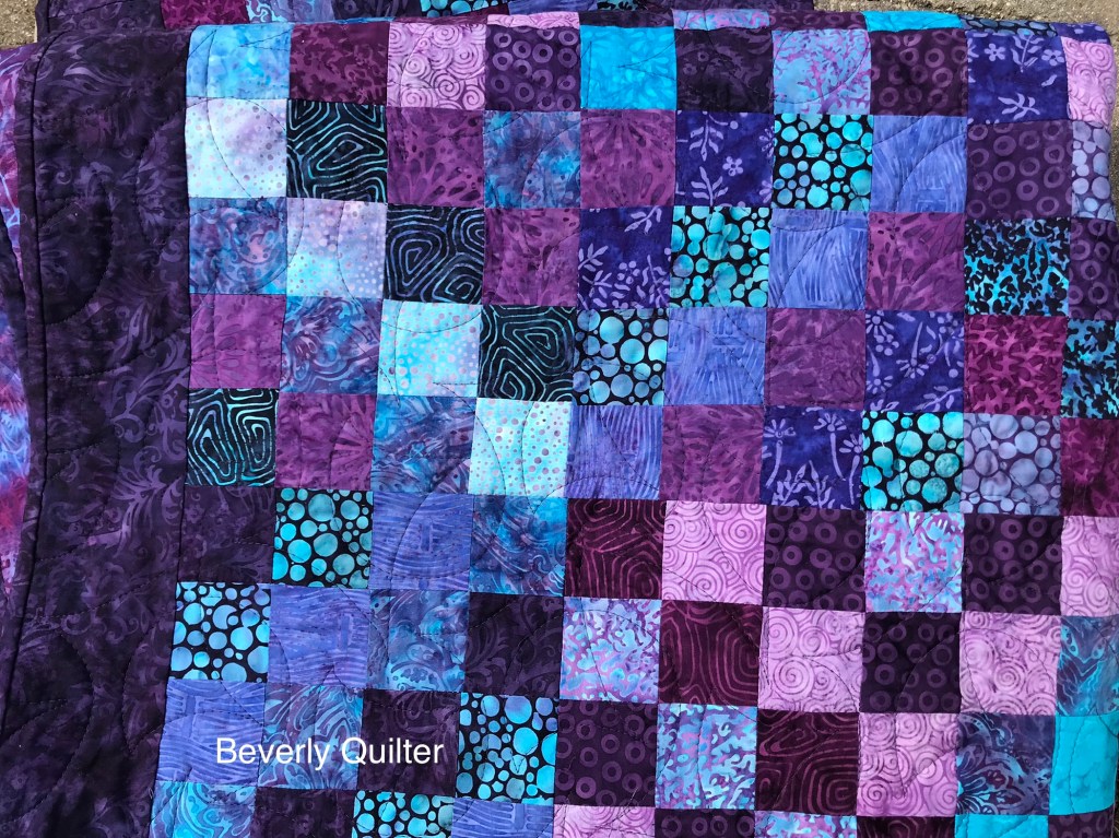I cut 2 1/2” strips into 2 1/2” square patches. I chose four colors for each block and sewed the patches in a diagonal design. The blocks were then grouped in fours with the diagonals placed so that I got an impression of a diamond. These groups of four were how I built the quilt. I backed this quilt with a purple and turquoise batik and quilted it in an all over edge to edge abstract design with purple thread.
