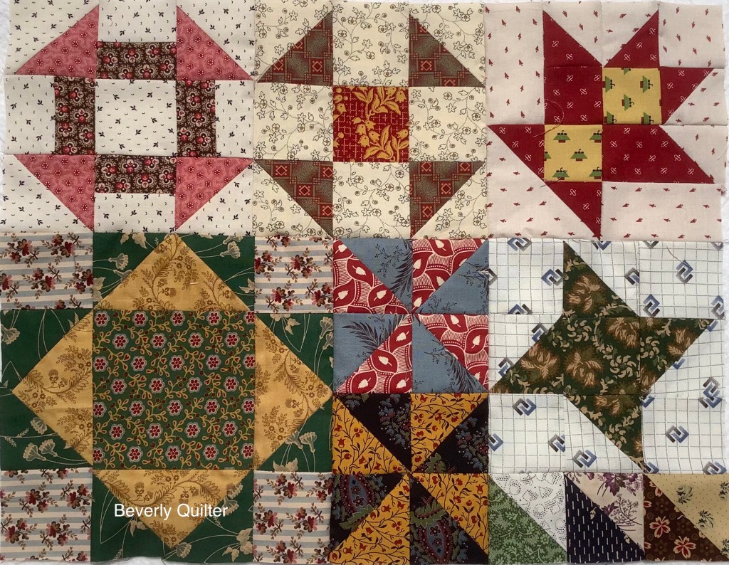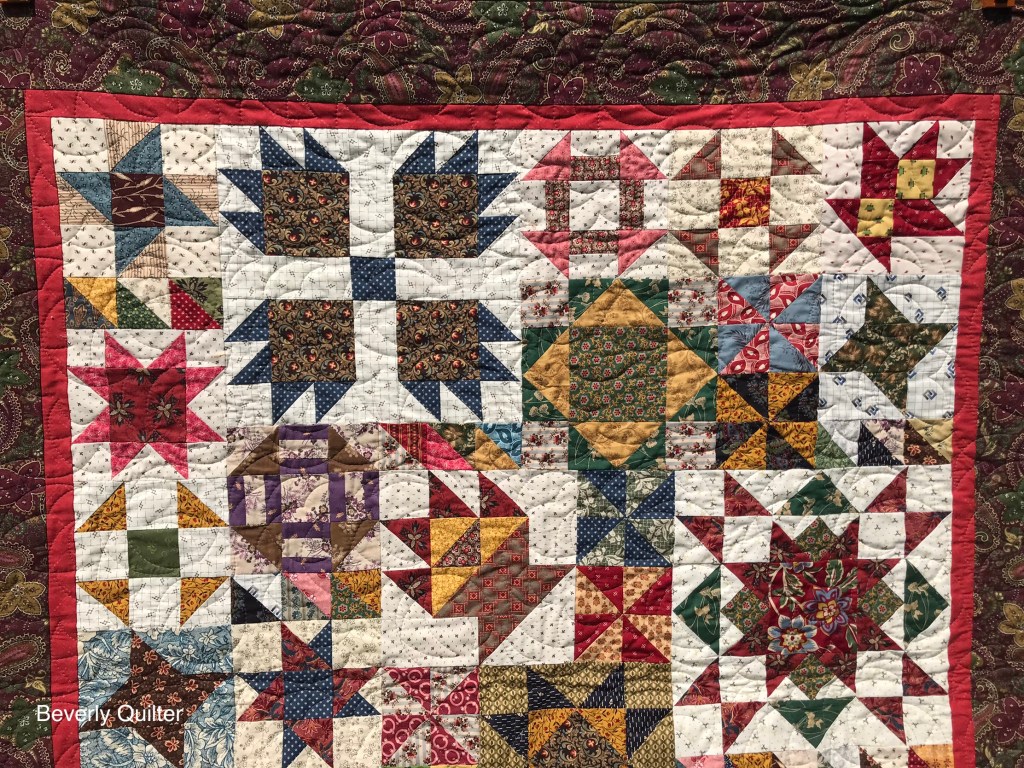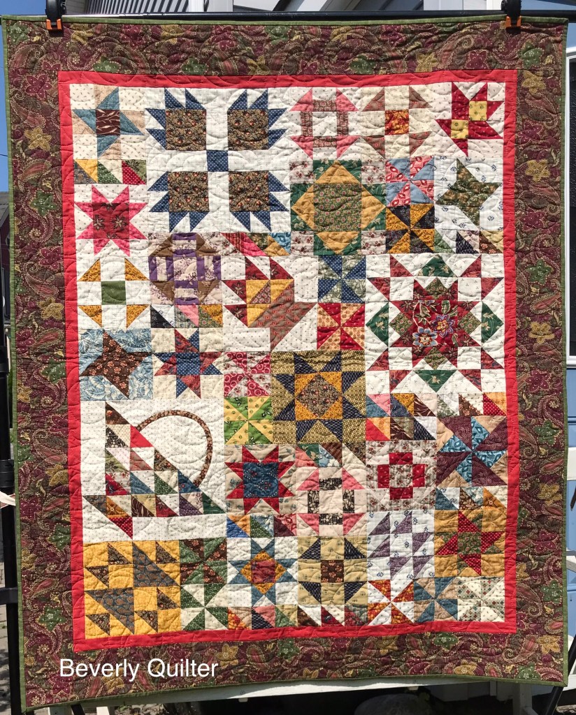 The first two quilts sold rather quickly so I thought I’d make another one. I’ve stayed with using the Civil War Reproduction style fabrics,I love the rich assortment of colors they offer. Once again I made a variety of block styles and sizes and put them together in a puzzle layout. This lap sized quilt measures 46”x55” and I have included a 2” hanging sleeve for anyone who might like to hang it. This quilt sold via private sale.