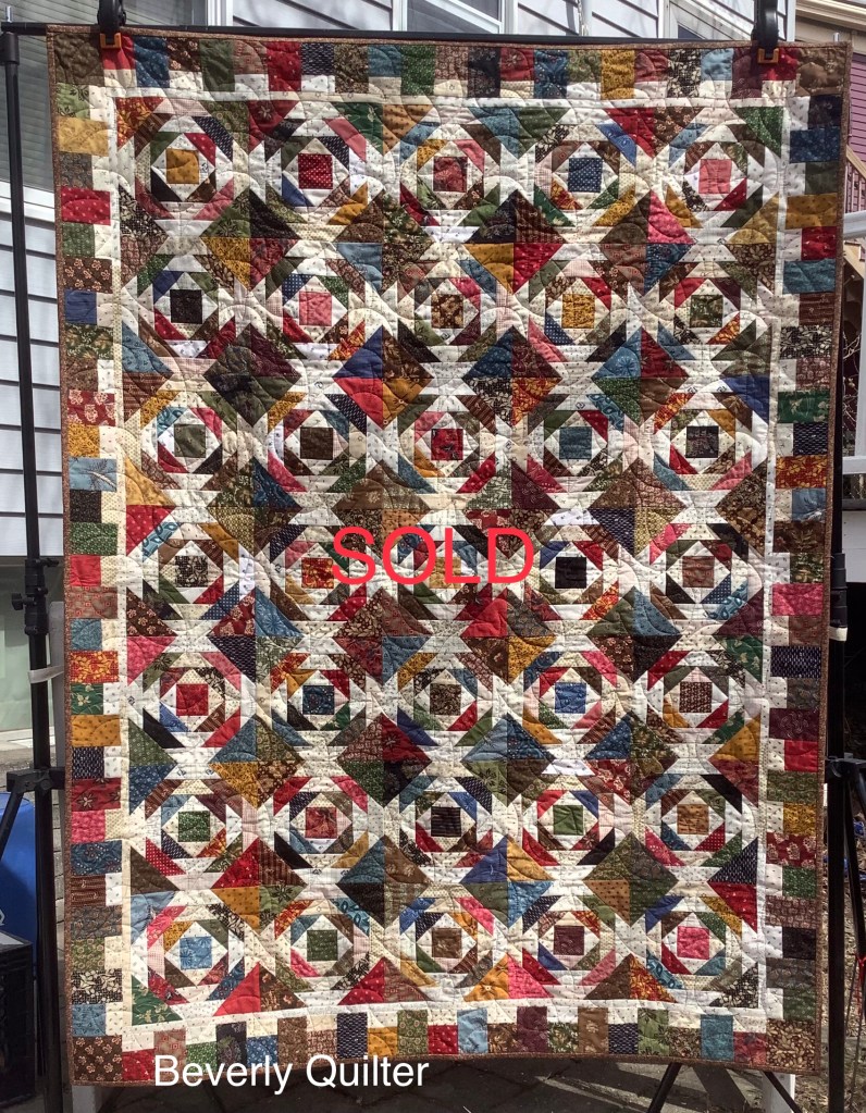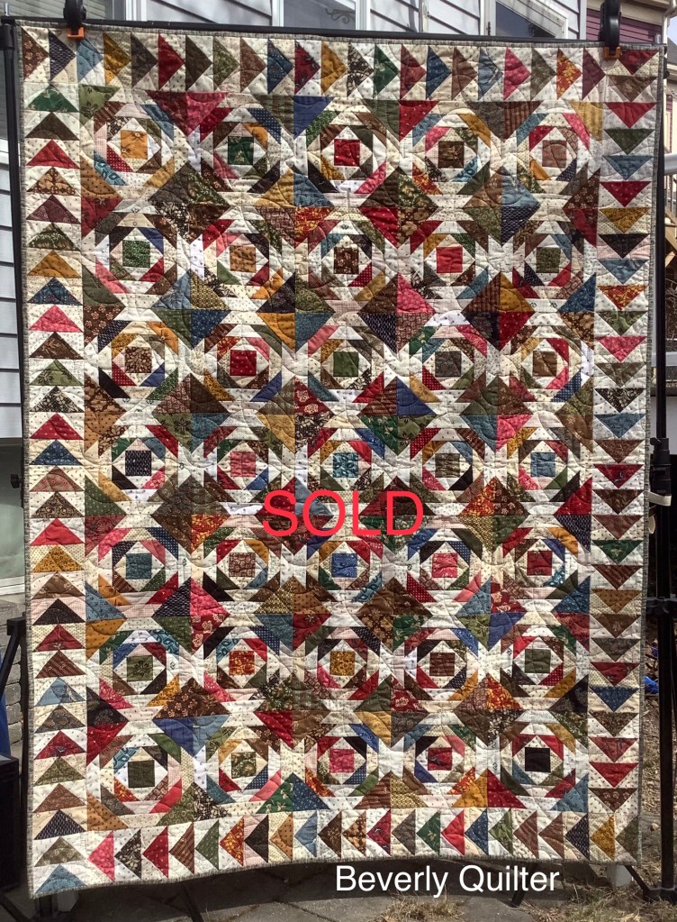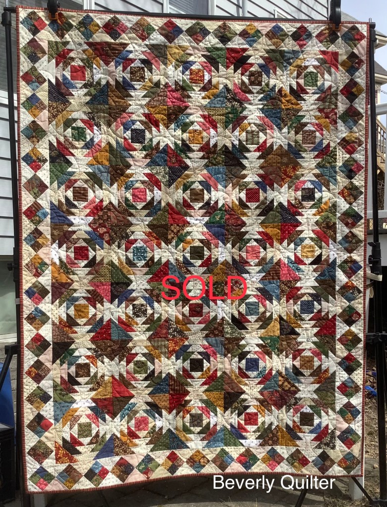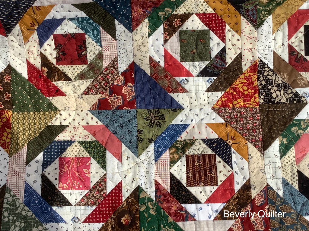 I just love working with these civil war reproduction style fabrics.Such wonderful colors! The block pattern is an old time classic that has been working up well for me. Details on making these blocks can be seen on a previous post on this blog.The pineapple quilts I had made last year sold out quickly so I decided to make three more. All three of these have now sold on http://www.eBay.com. Guess I’ll have to plan on making some more!