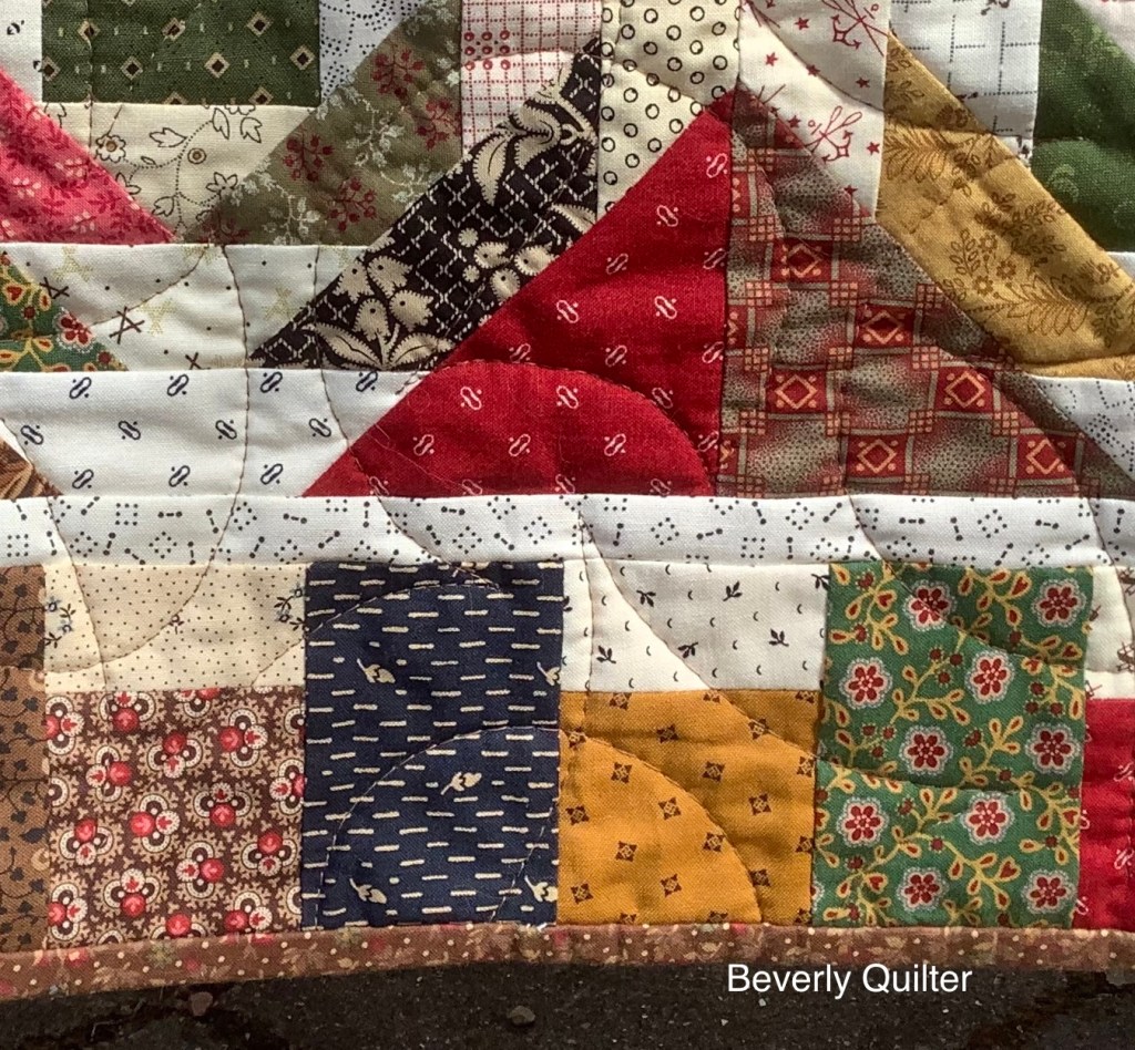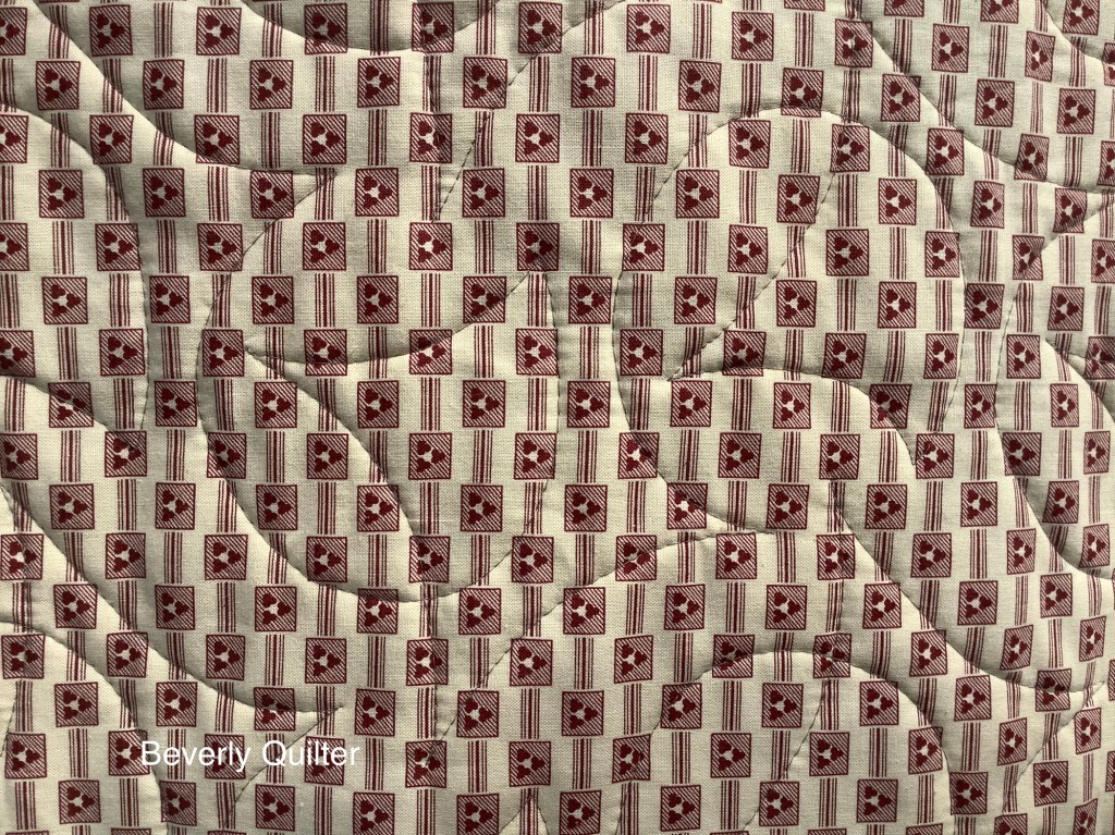 In order to have a little variety of choices I made a different outer border for each one. I’m curious to see which quilt sells first! So far the most popular one has been the one with the four patch border. Turns out the four patch bordered one sold first! Each quilt was backed with the same off white with red print fabric typical of the era and all are quilted with the same edge to edge abstract design.