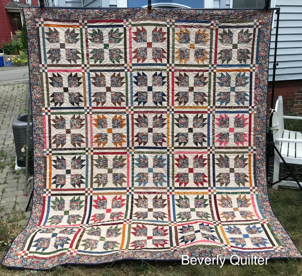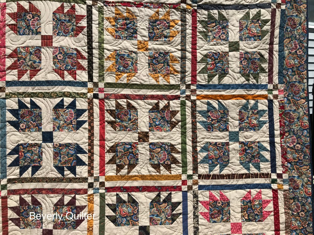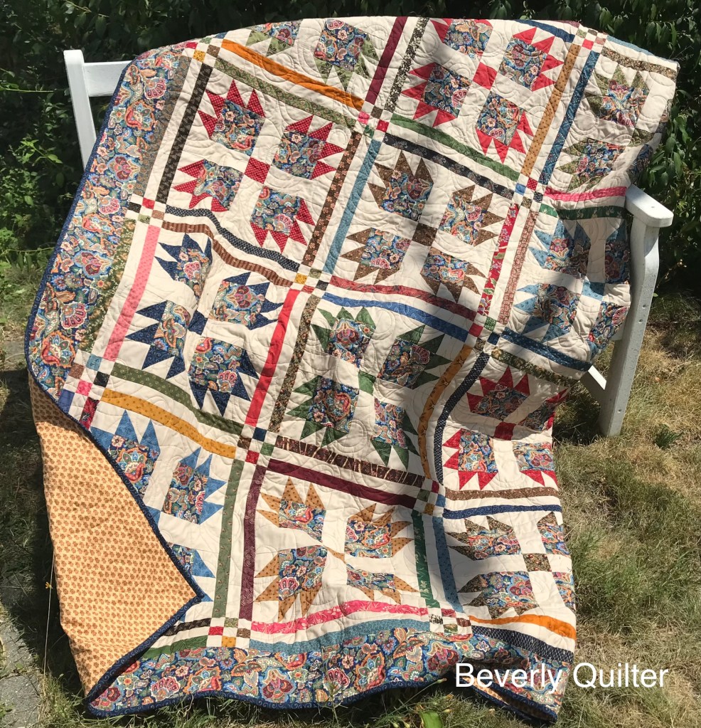 The classic pattern “Bear Paw” has always been one of my favorites to make. This time I used a very colorful paisley print as the focus fabric. I used the paisley fabric in the outer border and the pads of the paws. I then picked out mostly civil war reproduction fabrics in assorted colors to make the claws and parts in the sashing. To set off all these colors,I used a plain beige fabric as the background in the paw blocks and as part of the sashing.