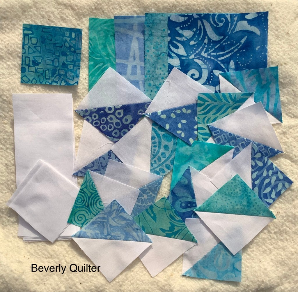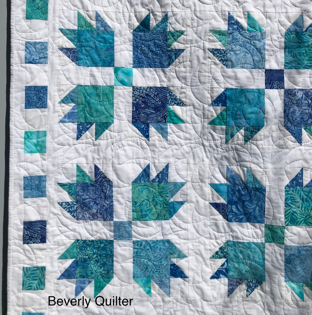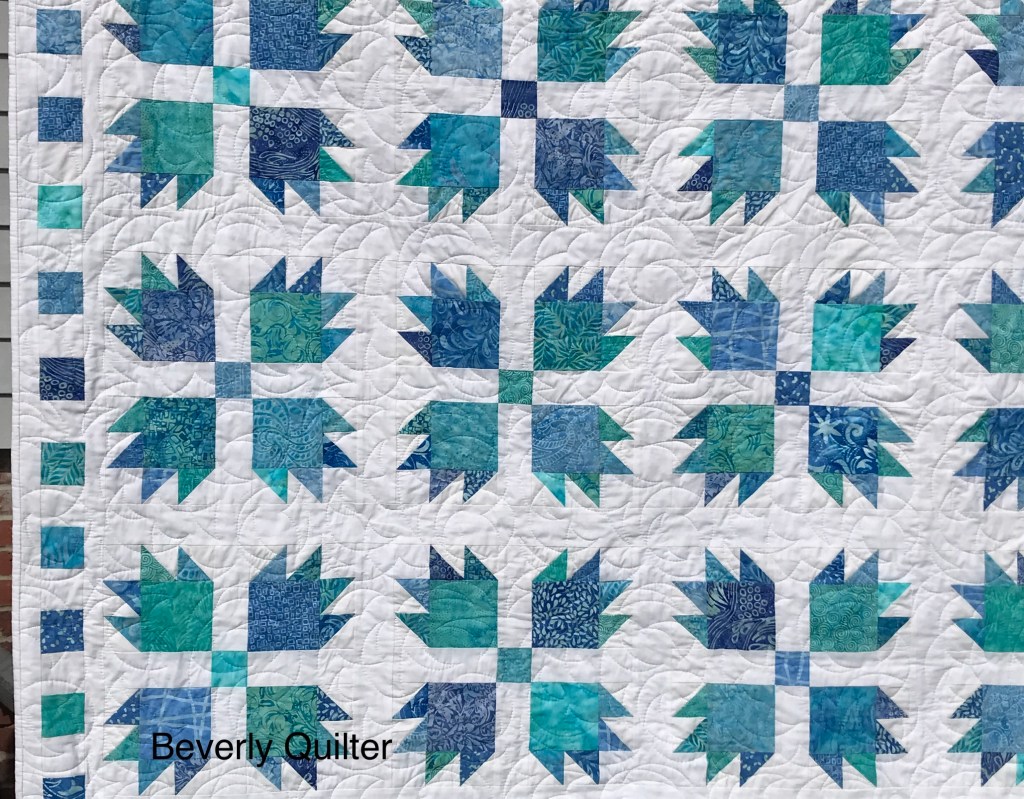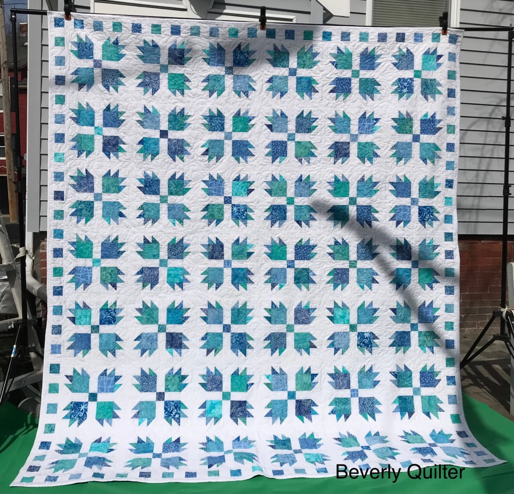 Working with some beautiful medium blue and turquoise batiks I just had to make something wintery and wonderful. I chose to make another Bear Paw quilt which is one of my favorite patterns. I think the solid white batik really sets off the “paws”. This big 88” x 102” quilt sold on eBay.