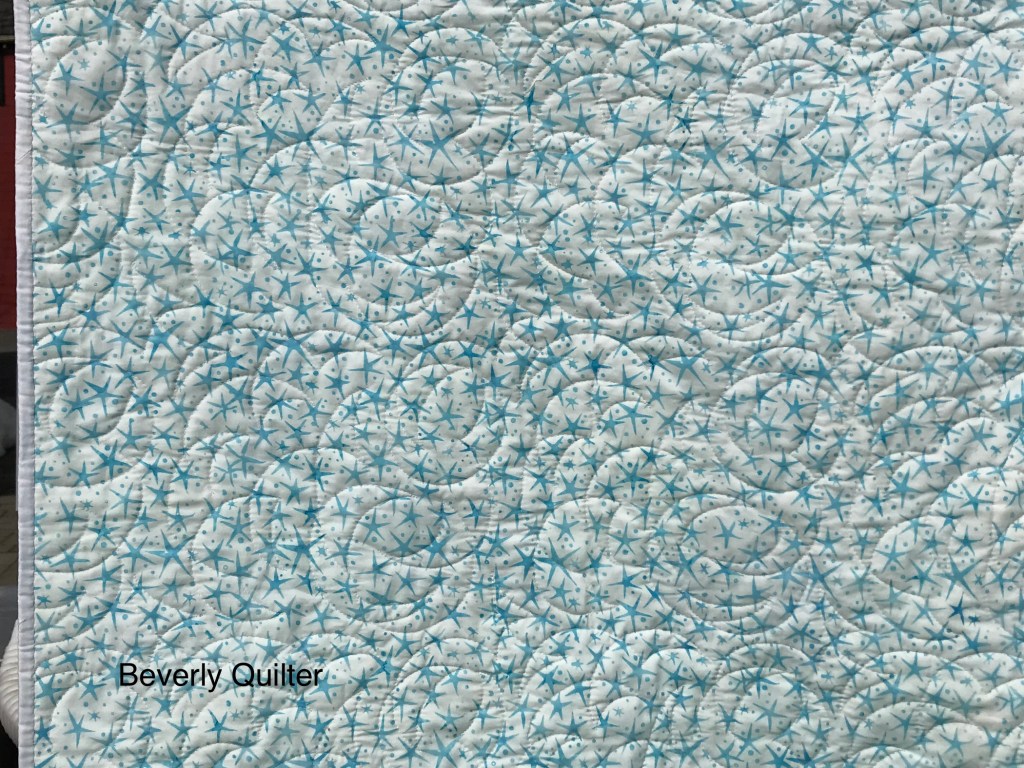 This quilt involved using a lot of those half square triangles to make the “claws”of the paws. I found a really nice batik of white printed with turquoise stars to back this quilt. I thought it was fitting since I was naming this one “Ursa Major”. I machine quilted this in an all over edge to edge abstract design with white thread.