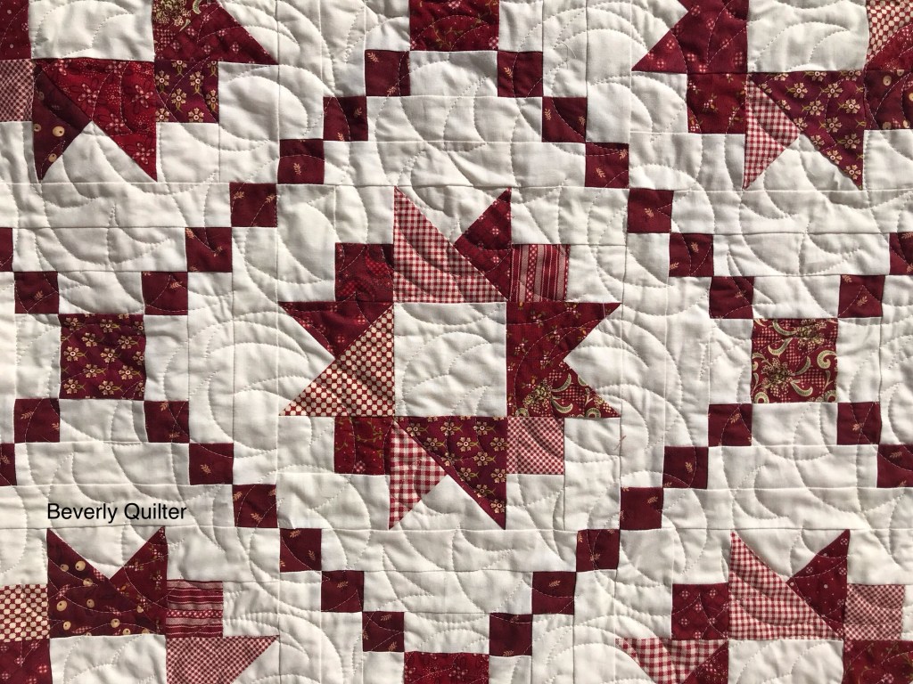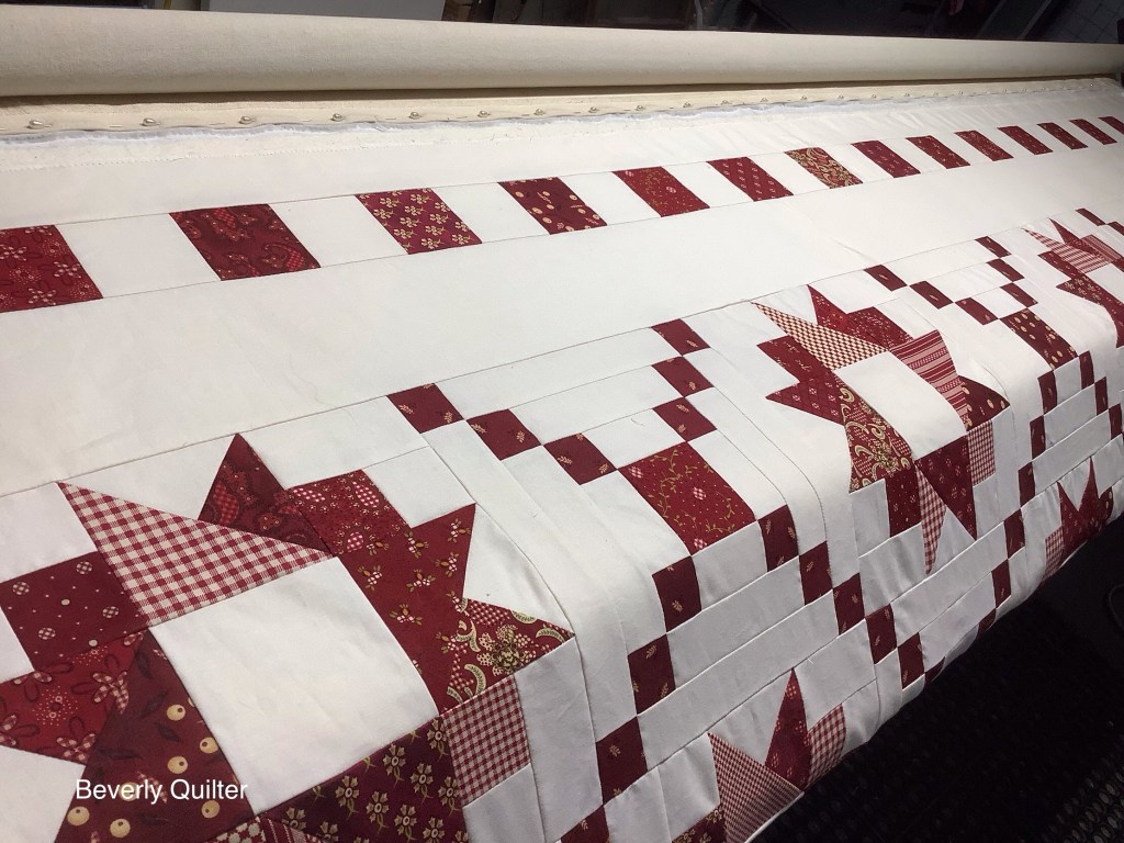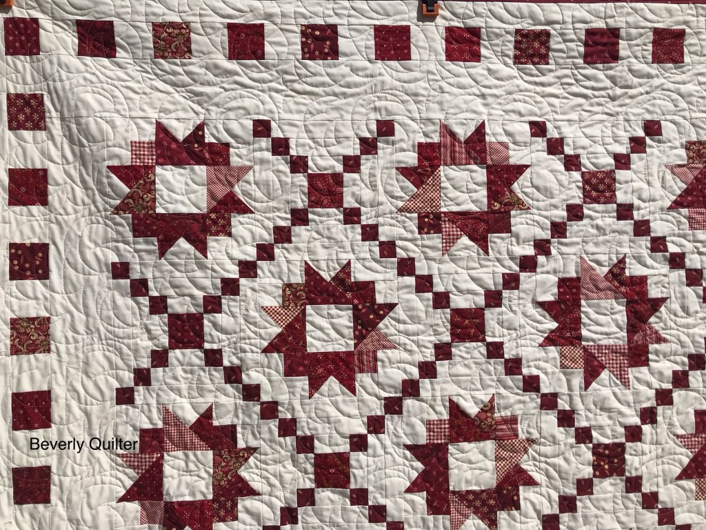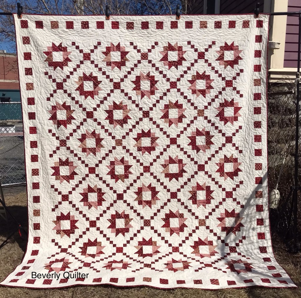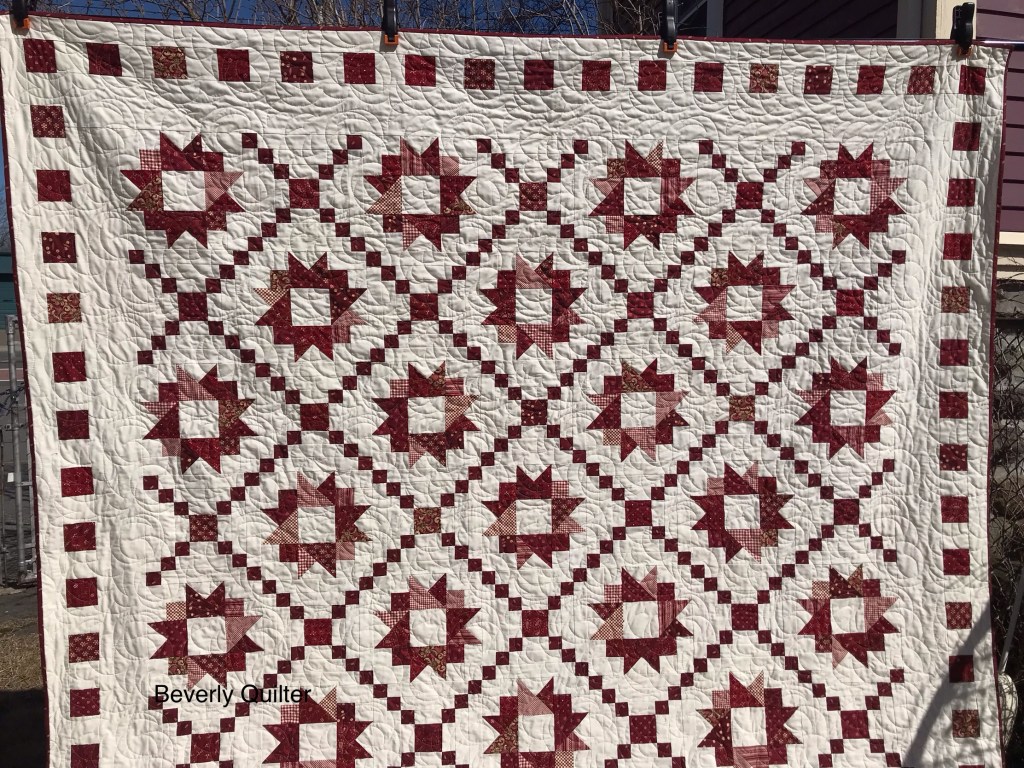 This queen sized quilt began with a group of coordinating fabrics from Henry Glass Fabrics called “Garnets & Gingham”. I went with a solid off white fabric for the background to set off the beautiful red prints. This quilt measuring 87”x106” is up for sale on eBay and may be found by searching for “red and white quilt”.