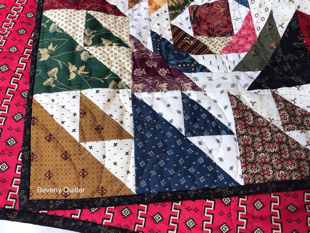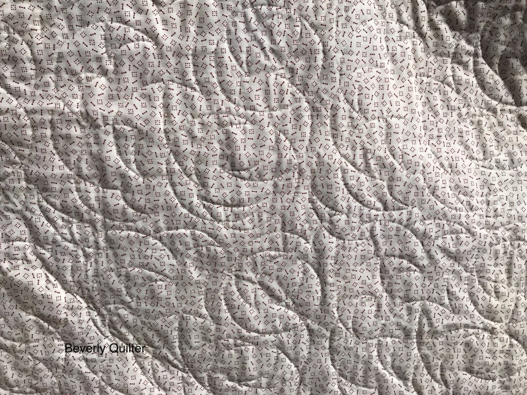 The backing fabric is an off white with tiny red dots design print. I used an off white thread and machine quilted this in an all over abstract design.