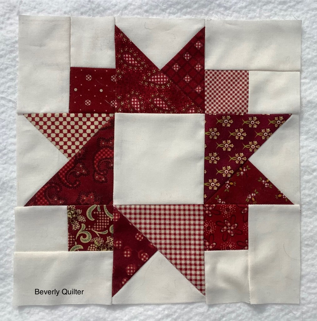 Merging two different classic blocks created a pleasing design for this quilt. To keep it simple and not detract from the center of the quilt I went with little red squares alternating with white in the border.